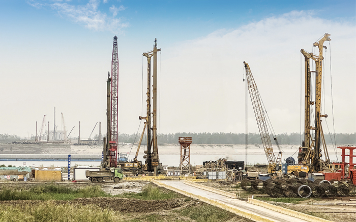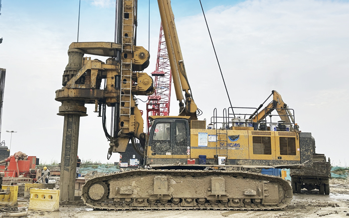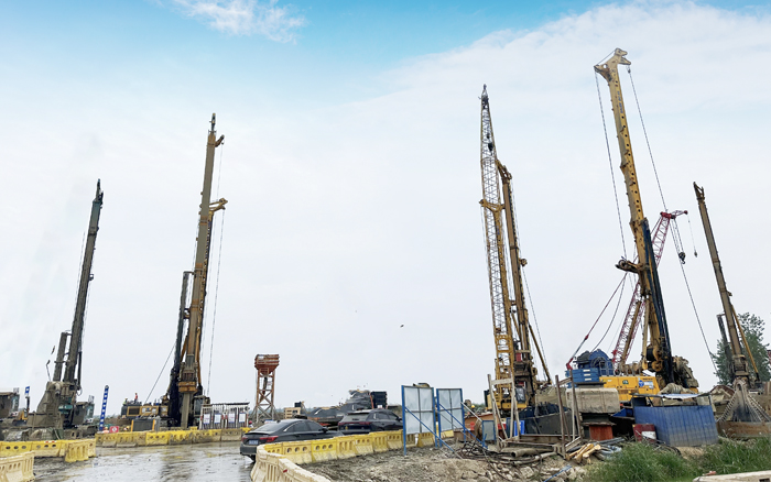 徐工XR550D、XR580HD等多臺徐工大噸位旋挖鉆機群憑借精湛的技術和卓越的性能,成功攻克了地層復雜、工期緊迫等多重難題,平均成孔周期68小時,全面提速大橋樁基礎建設。