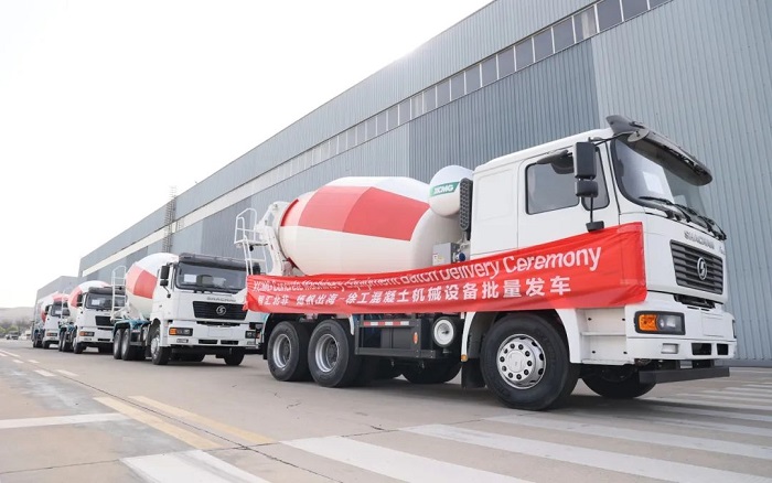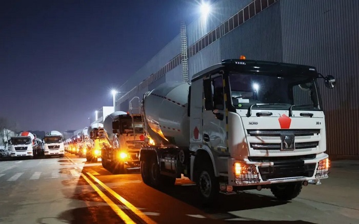 百余臺定制版52/58/62米泵車、12方攪拌車,列隊鳴笛,從徐州基地發往中東。產品采用耐高溫液壓系統與節油技術,適配中東極端環境,助建NEOM未來新城等超級工程。
