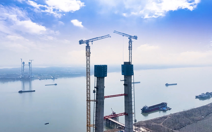 春和景明、碧波蕩漾,巍峨的武漢雙柳長江大橋北主塔正拔地而起,兩臺徐工XGT2230A-100S正高效精準完成塔柱的拼裝,助力大橋北主塔加速建設。