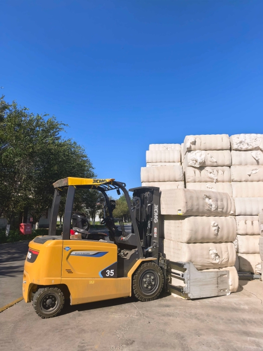 棉花廠的作業場景復雜,原材料搬運與成品轉運任務繁重。以往,傳統搬運設備在效率、環保等方面存在諸多局限。而此次進駐的徐工鯤鵬電動平衡重叉車,擁有強大的性能優勢,堪稱棉花廠物料搬運的 “理想搭檔”。它采用鉛鋰同平臺設計,能滿足不同場景、不同客戶多樣化的能源需求。無論是在原材料堆放區搬運沉重的棉花包,還是在成品倉庫轉運打包好的棉產品,都能輕松應對。其驅動系統、起升系統均采用免維護全交流大功率電機,前輪電機獨立控制,動力強勁,大大提升了搬運效率。
